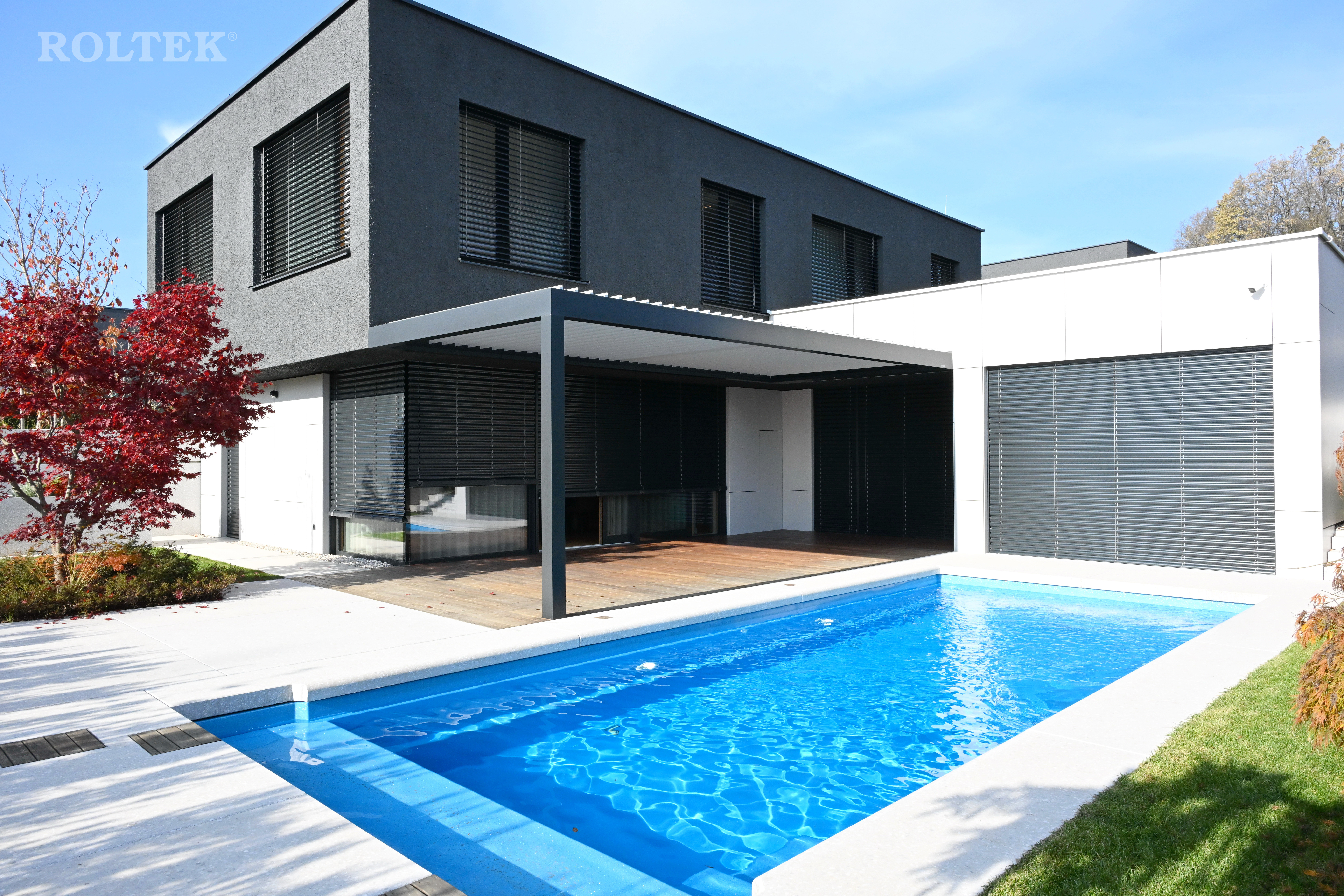 Ein Haus mit sorgfältig geplantem Interieur, das von den Außenjalousien HERO beschattet wird