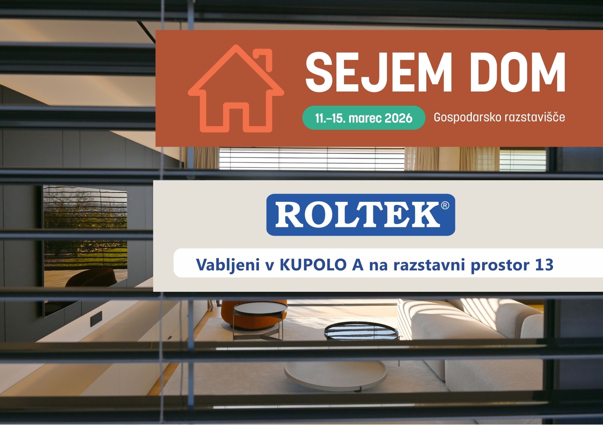 Vabimo vas, da nas obiščete na Sejmu Dom 2026 in odkrijete celoten ROLTEK prodajni program vrhunskih sistemov senčenja, komarnikov in garažnih vrat ter najnovejše tehnične izboljšave za udobno, varno in energetsko učinkovito bivanje.
